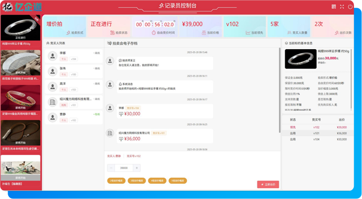 記錄員可在記錄員控制臺協(xié)助現(xiàn)場/線下競買人出價,實現(xiàn)線上線下同步拍!